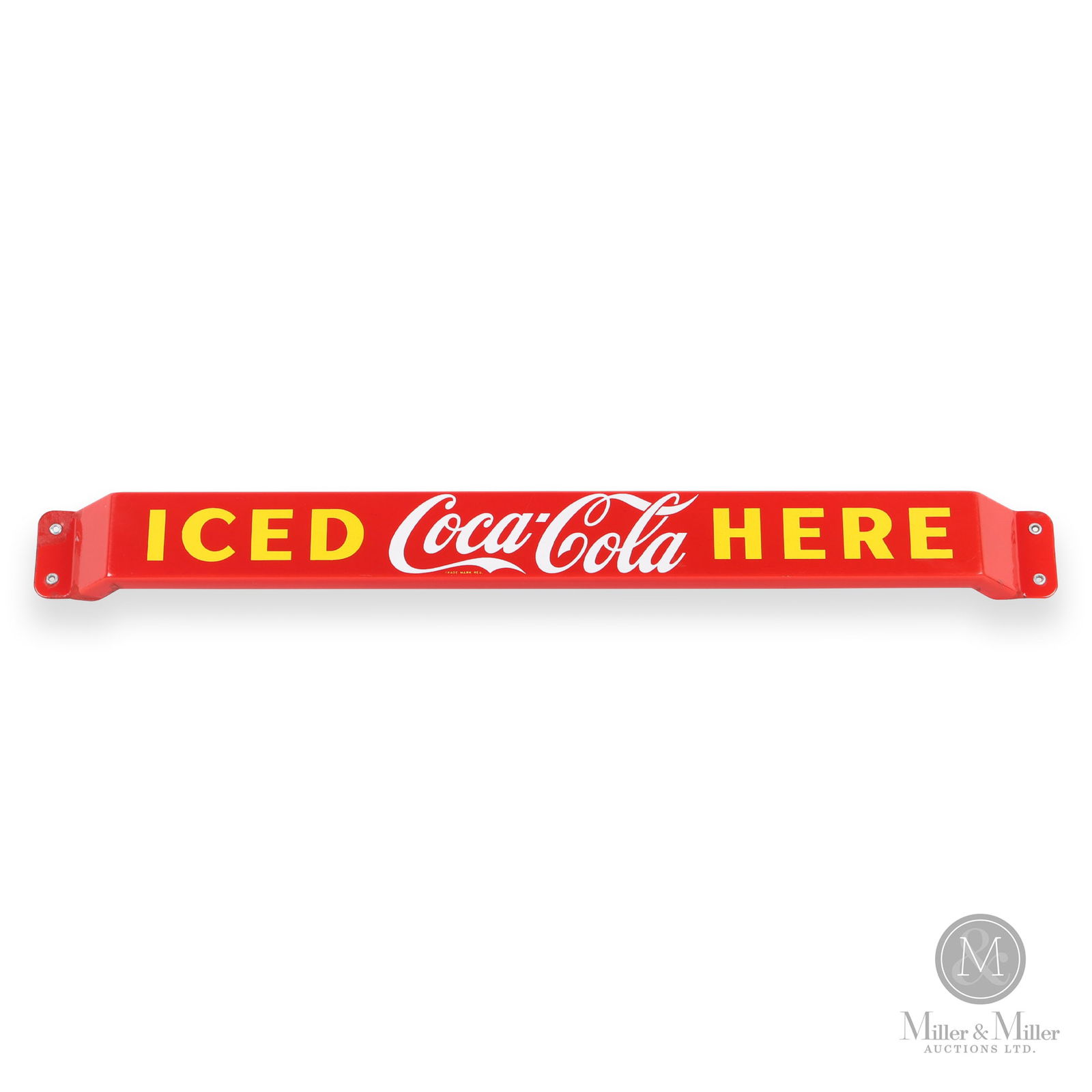 SoldCoca-Cola "Iced Here" Door Push BarCanadian. 1952. Single-sided porcelain (SSP). Marked, "Made in Canada 1952 P&M", on back. 3" x 31" x 1.5".See Sold Price