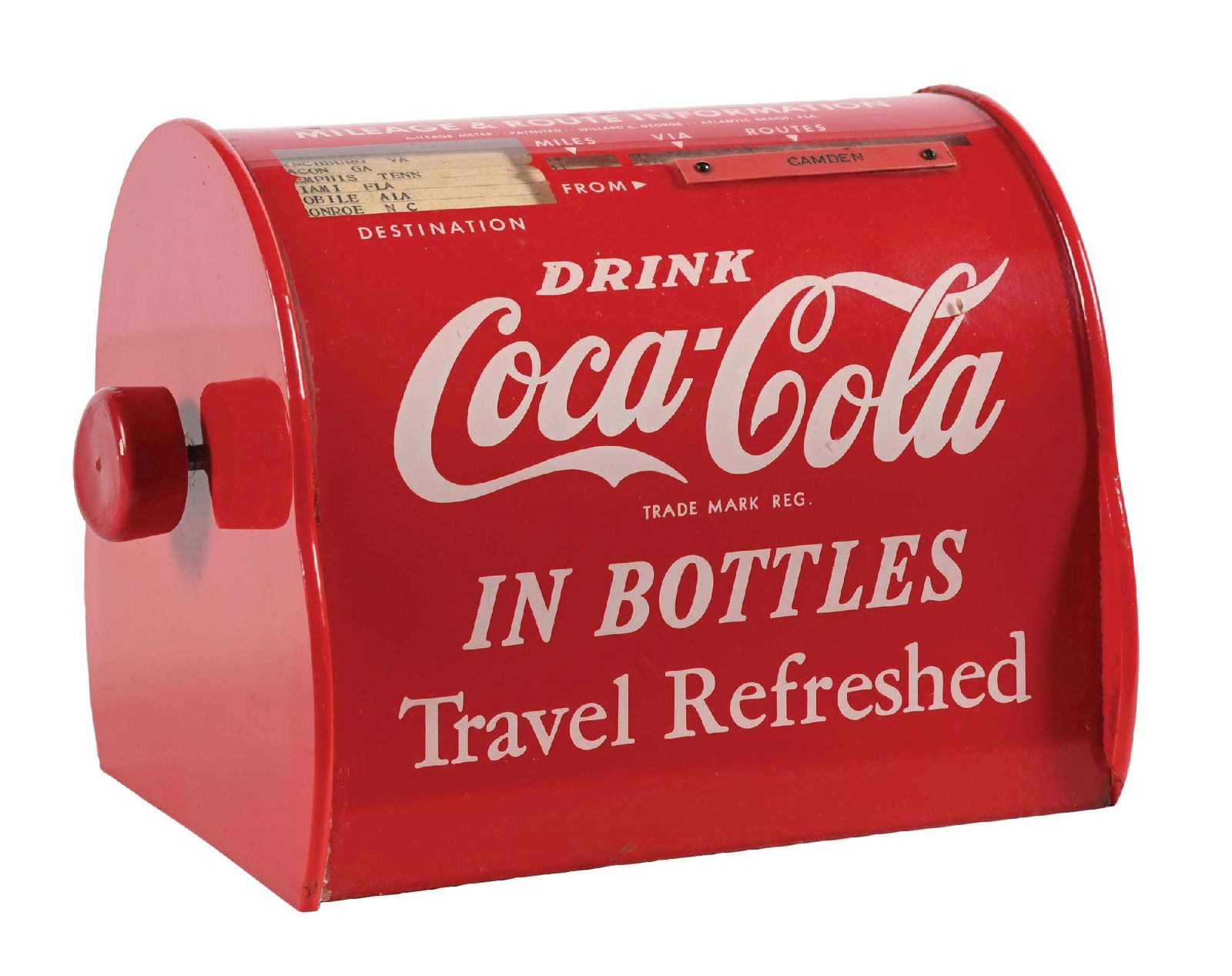 SoldCoca-Cola Mileage MeterBright red plastic body houses a reel with locations and distances with knobs on either side to spin the reel. Missing one knob and plaquette that states the originating location. (Very Good). 7-1/2"WSee Sold Price