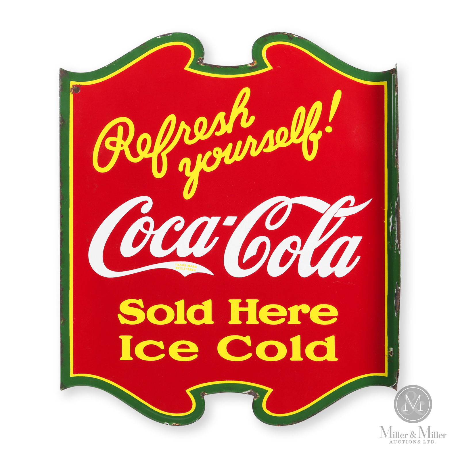 SoldCoca-Cola 'Refresh Yourself' Flange SignCanadian. 1930s. Die-cut double-sided porcelain flange (DCDSPF). Marked, "St. Thomas Metal Signs, St. Thomas Ont.", facing side lower right edge. 20" x 17" x 1.75". From the Late Robert Spittel CollecSee Sold Price