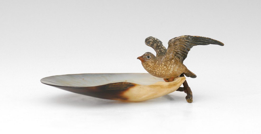 COLD PAINTED BRONZE BIRD AND SHELL ASHTRAY