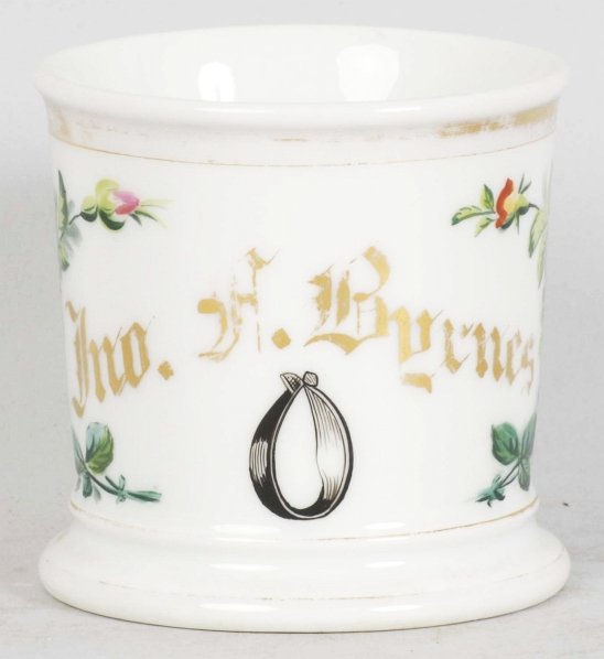 SoldCASKET MAKER'S SHAVING MUG.Has the name "J. F. Shelly" in gold gilt. Mug is stamped "Cfh/Gdm France" under base. Detailed image of a large coffin. Condition: (Excellent+). Dimensions: 4 - 1/2" x 3 - 1/2" x 3 - 1/2".See Sold Price