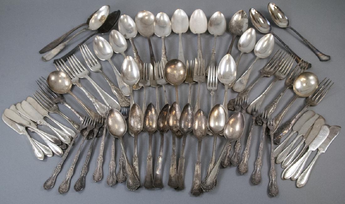 SoldCollection sterling silver flatware, incl. TiffanyCollection sterling silver flatware, incl. Tiffany, 19th/20th c., (41) pieces, mostly American, including (7) serving spoons, (4) serving forks, (2) pierced spoons, (1) set tongs, (2) cocktail forks,See Sold Price
