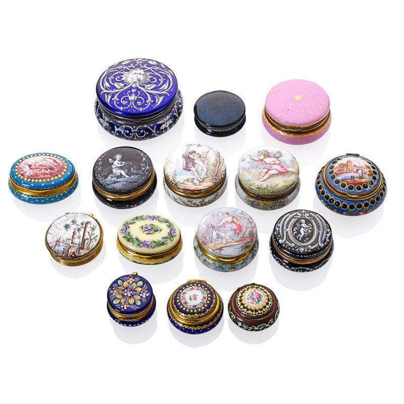 COLLECTION OF 15 ENAMELED PATCH OR SNUFF BOXES