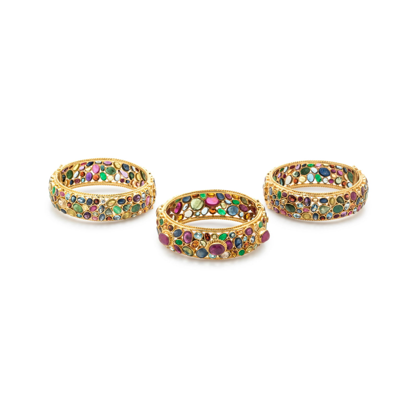 SoldYELLOW GOLD AND MULTIGEM BANGLE BRACELET SETYELLOW GOLD AND MULTIGEM BANGLE BRACELET SET Consisting of two elephant motif bangles containing numerous round mixed cut sapphires, emeralds and rubies and numerous seed pearls, hinged with side clasSee Sold Price