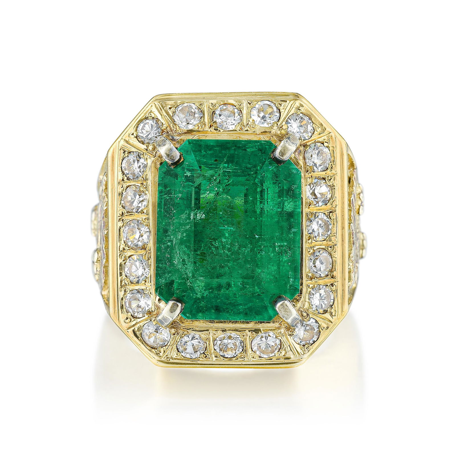SoldColombian Emerald Ring w/ Diamond Halo & ShouldersGenuine Emerald and Earth-Mined Diamond Ring. This 1.77 carat octagonal-cut Colombian emerald has a soft glow that really catches your eye! It is set in a 14 karat yellow gold ring with .3See Sold Price