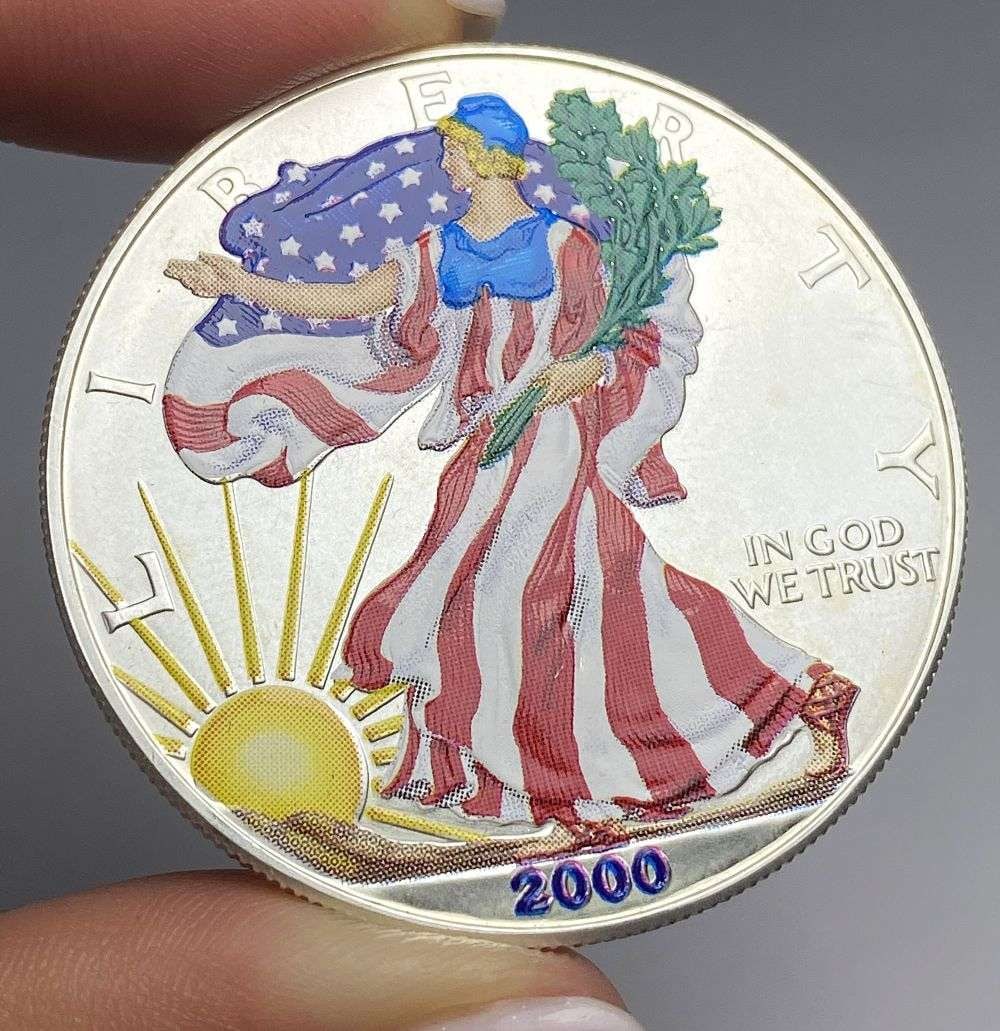 Sold2000 Colorized American Silver Eagle Dollar Coin2000 Colorized American Silver Eagle Dollar Coin. This comes in the original package is approx 2 1/2" x 3" x 1 1/4". A 2000 Silver Eagle's Lady Liberty is Colorized by a Special Ink PrSee Sold Price