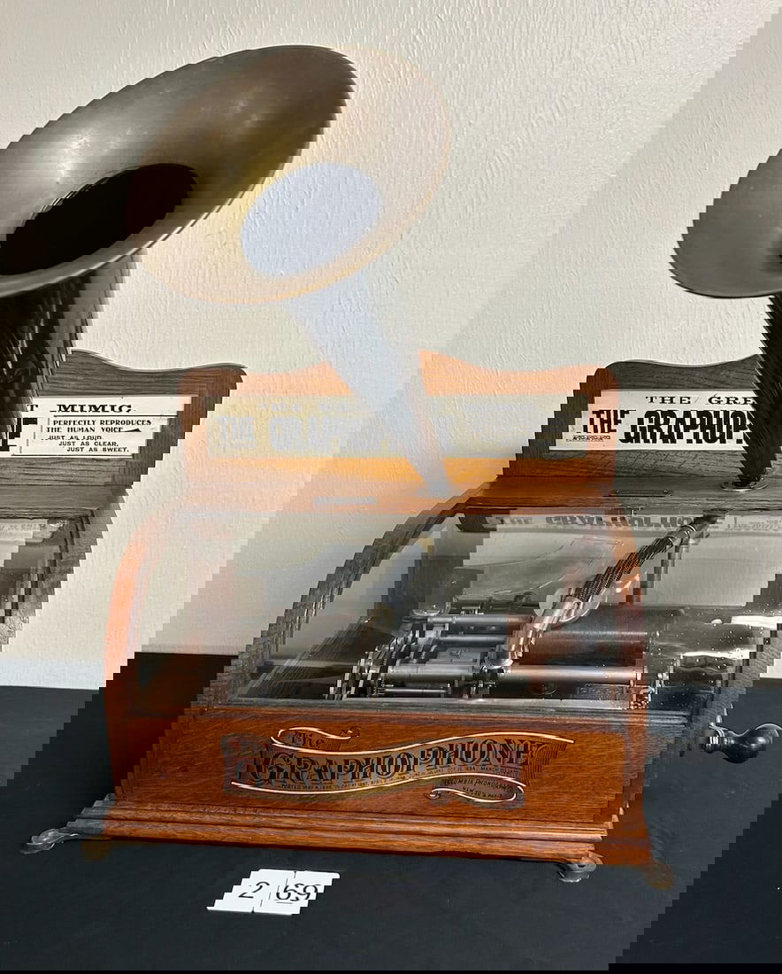 Sold5¢ Columbia Phonograph Type BS Graphophone With Horn.This phonograph, also known as the Eagle, was manufactured around 1898 by the Columbia Phonograph Co. The oak cabinet is in nice condition though the original paper marquee displays some mild soiling.See Sold Price