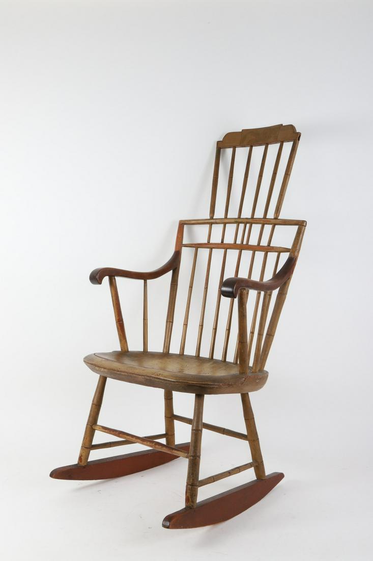 Sold18th C New England Comb Back Windsor Rocking ChairMixed woods, surface with heavy wear consistent with age. H: approx. 43 1/2". W: approx. 21 1/4". D: approx. 15". Our primary recommendation is to arrange shipping yourself using Blue Ridge Pack & ShiSee Sold Price