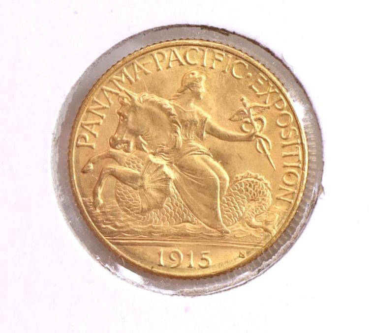 Sold1915 PAN-PACIFIC $1 DOLLAR COMMEMORATIVE GOLD COIN1915 uncirculated Panama-Pacific Exposition San Francisco mint commemorative one dollar gold coin. Excellent condition. Whites auctions will not take credit cards on gold jewelry, coins, silveror bullSee Sold Price