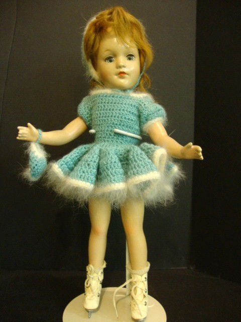 SoldCOMPOSITION - MARY HOYER.LOT. 14" Marked doll with brown sleep eyes, strawberry blonde mohair wig. Doll comes with wool knit clothing made from the original "Mary's Dollies" patterns. She is wearing the "Dolores" Skating outfSee Sold Price