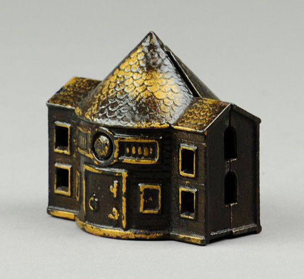 SoldCAST IRON BUILDING BANK.European with green and gold highlights and gold finial on top. Mold flaw on roof. Condition: (Very Good). Dimensions: 3" x 3" x 5".See Sold Price