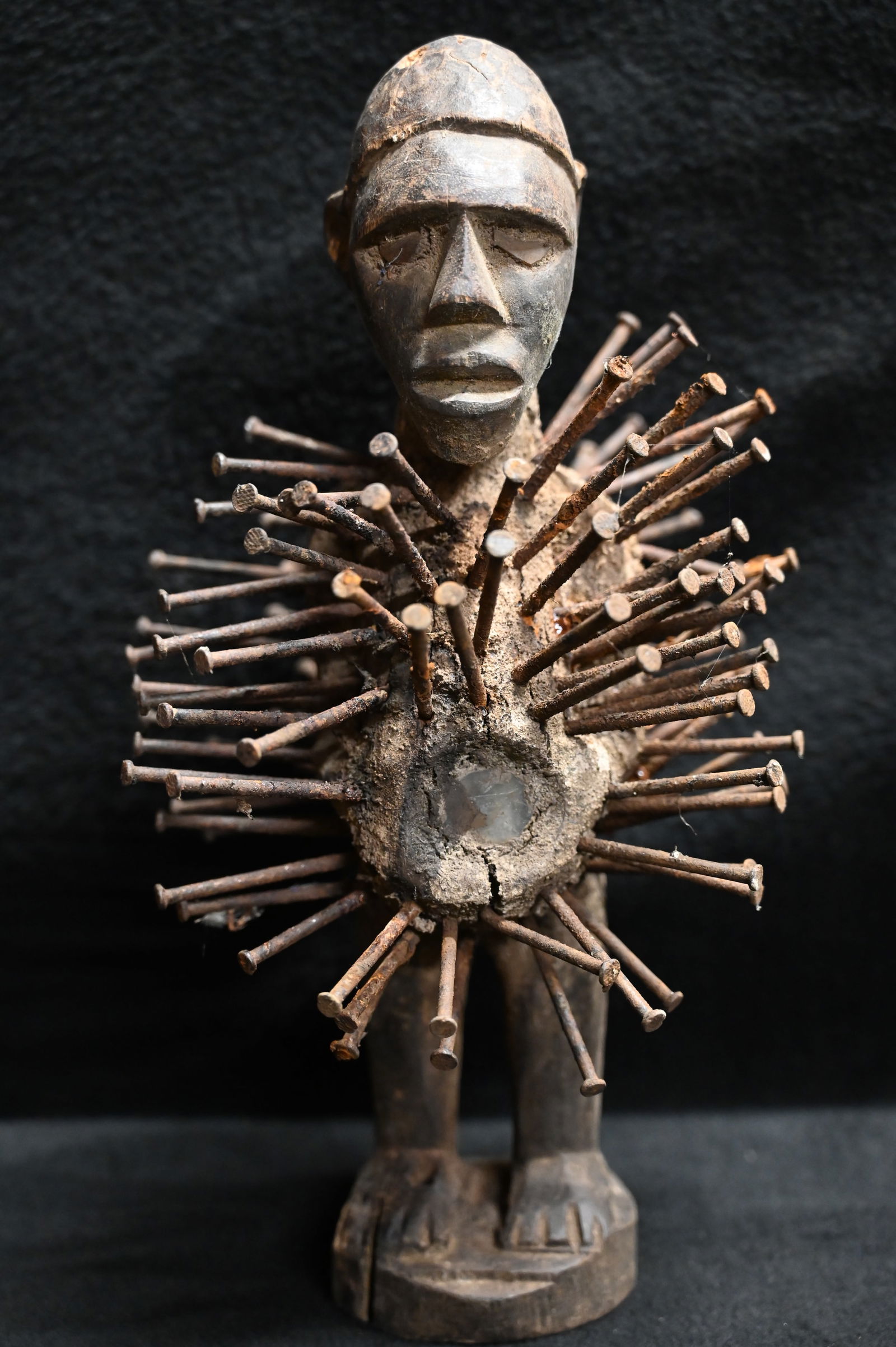 SoldCONGOLESE NAIL FETISH NKISI STATUE, - Height:.CONGOLESE NAIL FETISH NKISI STATUE. Patinated wooden statue. Materials used include wood; iron; glass; plant material; bird feathers and/or metal. - Height:.See Sold Price