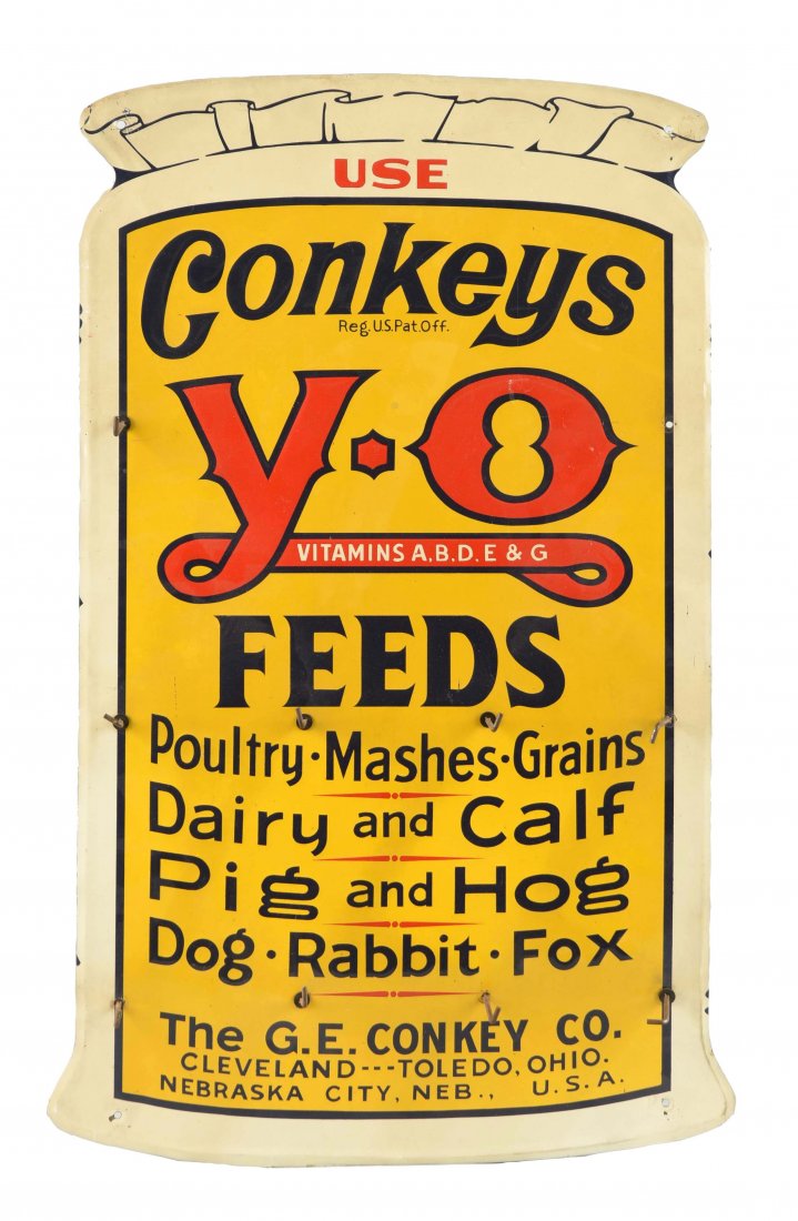 Conkeys Feeds Embossed Tin Advertising Sign.
