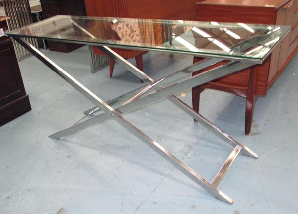 MODERN RECTANGULAR GLASS TOP TABLE DINING TABLE WITH X-FORM BASE H: 29". TOP, 81 3/4" X 46 1/2".Sloans & Kenyon4.3(87)$2007 days Left