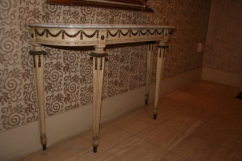 Sold19TH C. LOUIS XVI STYLE DEMI LUNE CONSOLE W/MARBLE TOP19TH C. LOUIS XVI STYLE DEMI LUNE CONSOLE W/MARBLE TOP 35"H 45.5" W 16.5" DSee Sold Price