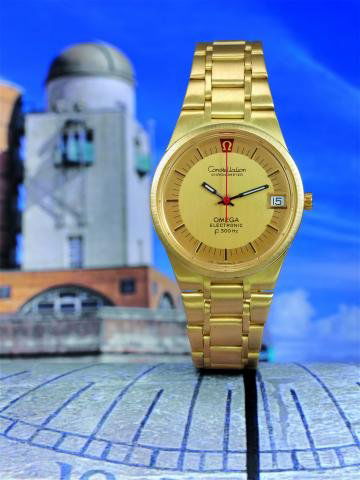 SoldOmega Constellation Tuning Fork WatchCase: Yellow gold case 750/1000, fluted bezel; Dial: Gold-colored dial with applied line markers, date at 3 o'clock, baton hands, signed "Omega Constellation Chronometer Electronic (OM)"; Movement: CoSee Sold Price