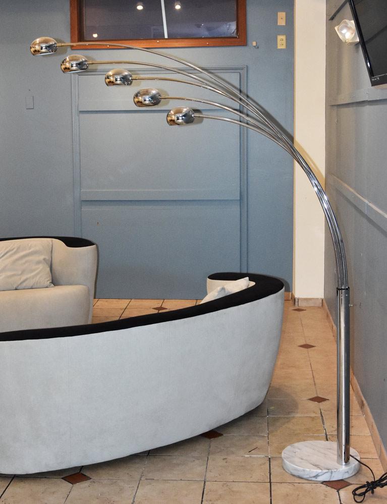 Sold70's Modern Arched Chrome Arm Floor Lamp. Marble Round70's Modern Arched Chrome Arm Floor Lamp. Marble Round Base. -- Dimensions: H: 70.5 inches: W: 57 inches: D: 13 inches ---See Sold Price