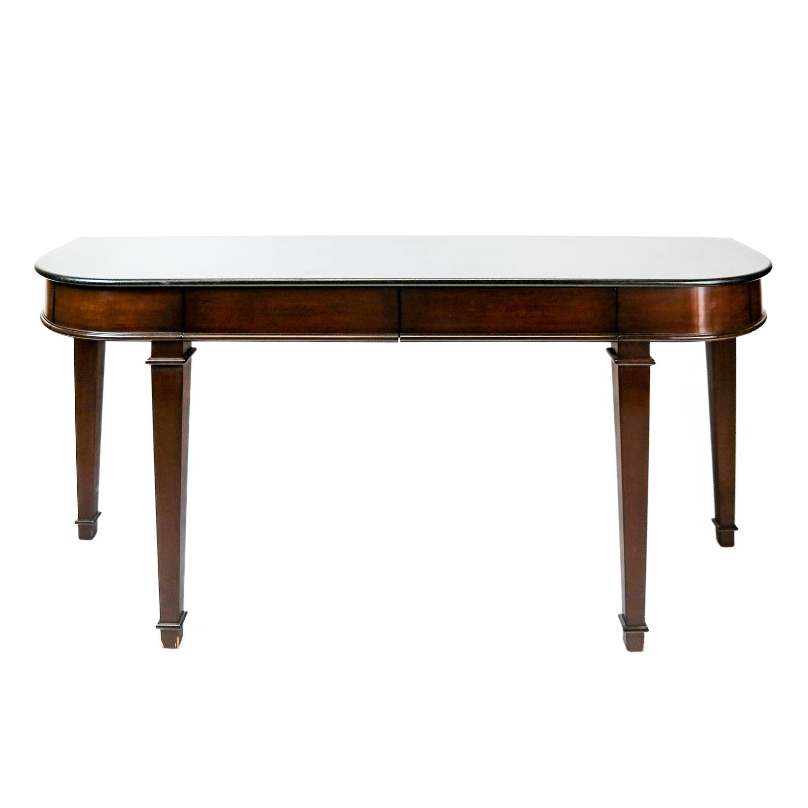SoldContemporary Console by Nancy CorzineLate 20th century mahogany demilune console table with two center and two side drawers, with a marble top. [34 1/2" H x 71" W x 20" D]. In good condition.See Sold Price