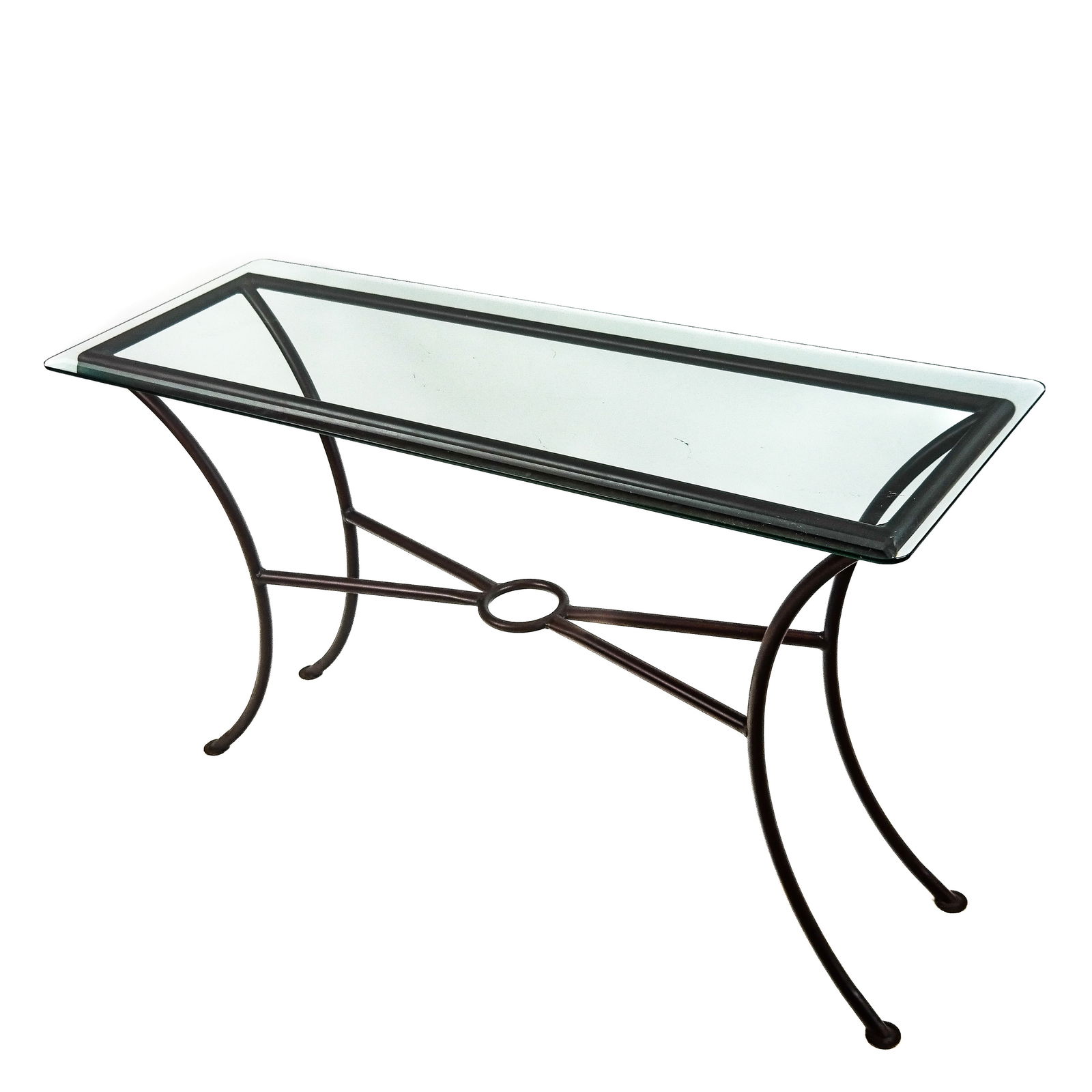 SoldContemporary Glass Top Console Table – Black Wrought Iron Base with Curved LegsElegant contemporary console table featuring a thick rectangular glass top supported by a black wrought iron base with graceful curved legs and a center stretcher for stability. The table’s design bSee Sold Price
