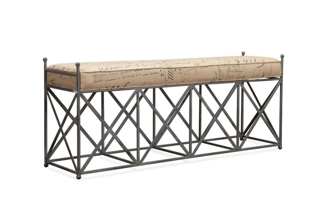CONTEMPORARY IRON BENCH WITH SCRIPT UPHOLSTERY