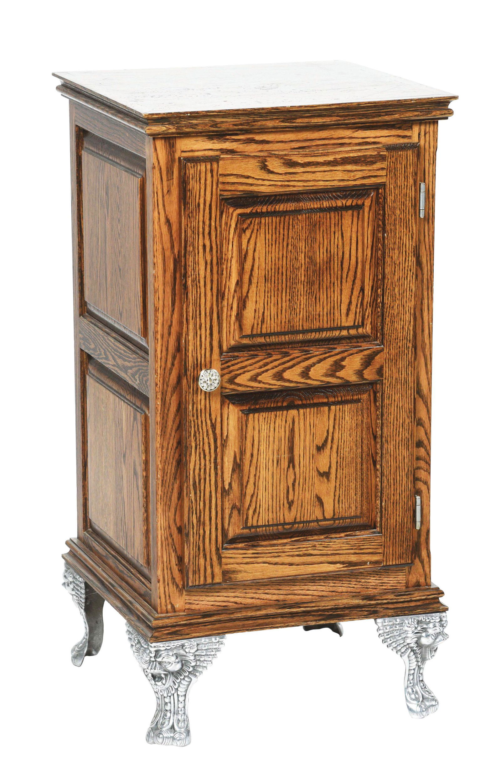 SoldCash Register or Slot Machine Stand, custom-made solidCash Register or Slot Machine Stand, custom-made solid oak stand w/leaded glass paneled door, raised on cast bronze lion paw feet, contemporary, Exc "like new" cond, 34"H x 17.5"W.See Sold Price