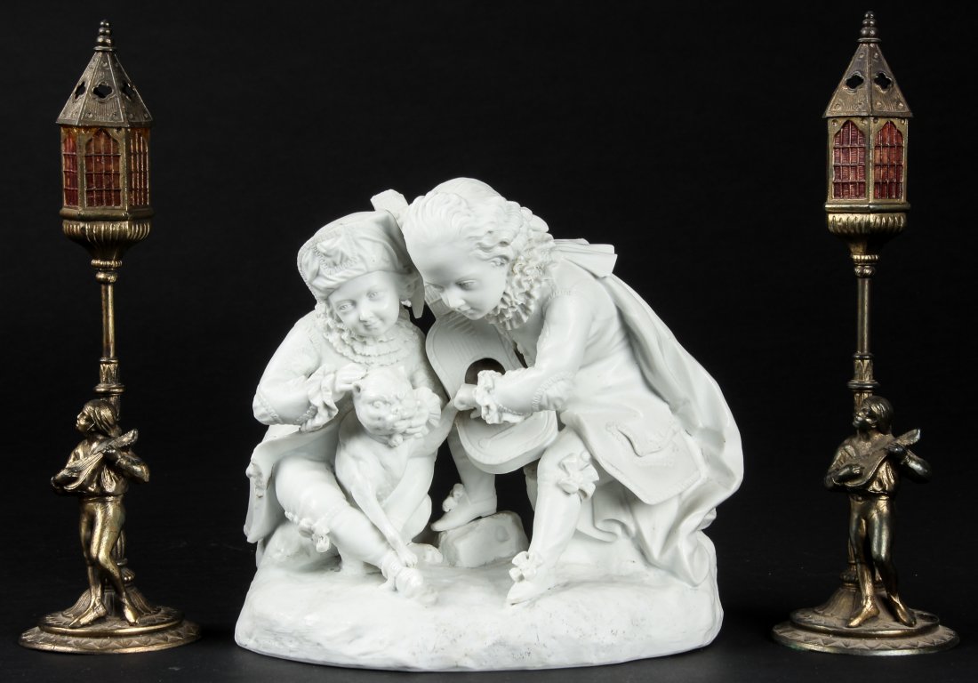 Continental Bisque Figural Group w/Metal Lanterns