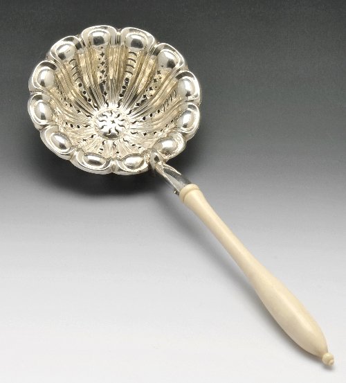 European silversmith. Antique silver tea strainer on tripod with shaft in turned ebony. GildedChairish Auctions4.5(10.4k)$70