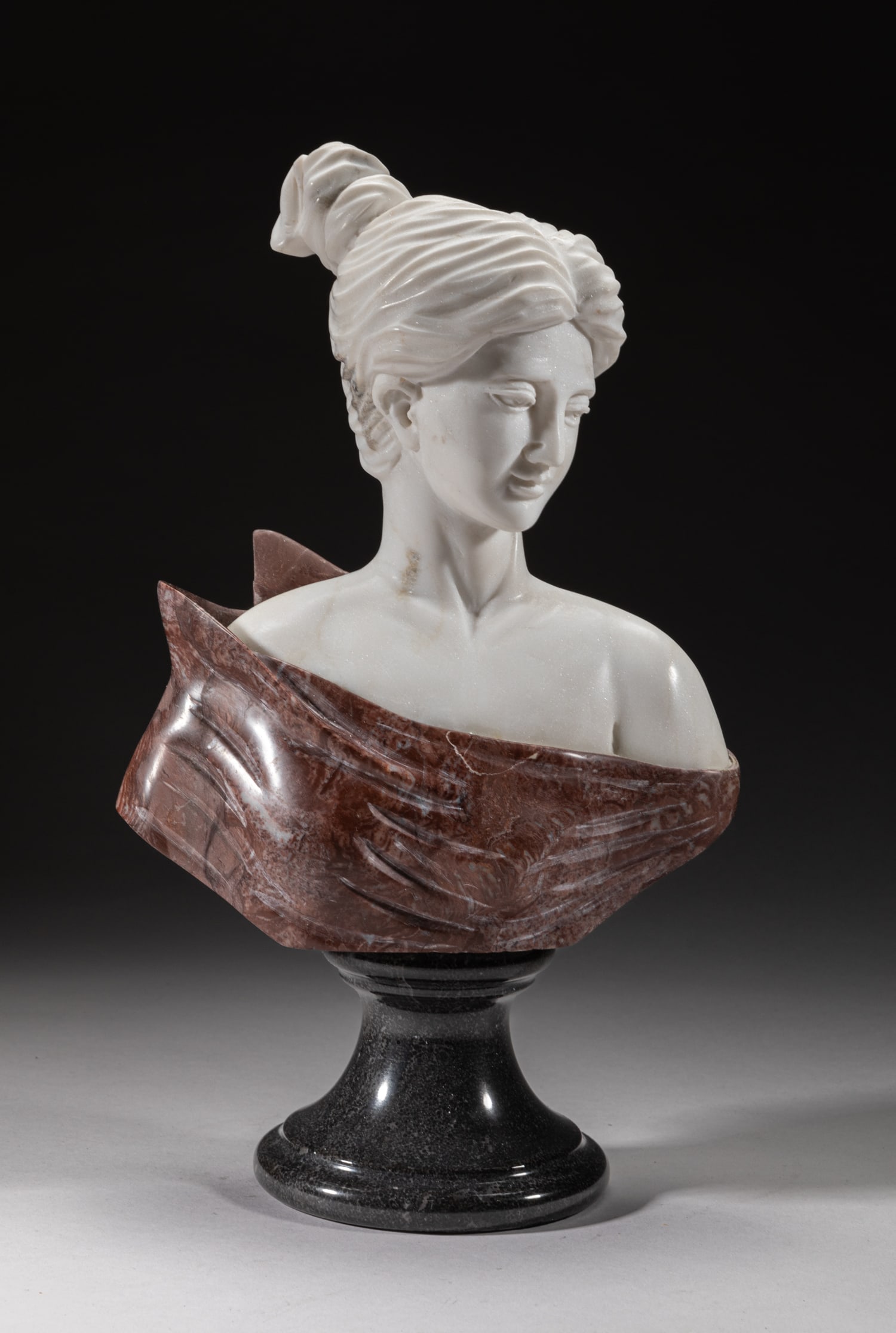 SoldMARBLE BUST SCULPTUREContinental Marble Bust Portrait of a Young Woman, on a marble base, unsigned, probably late 19th or early 20th c., 7 3/4" high, 7 1/8" x 3 1/4". Repaired break to base, small flakes to her head scarfSee Sold Price