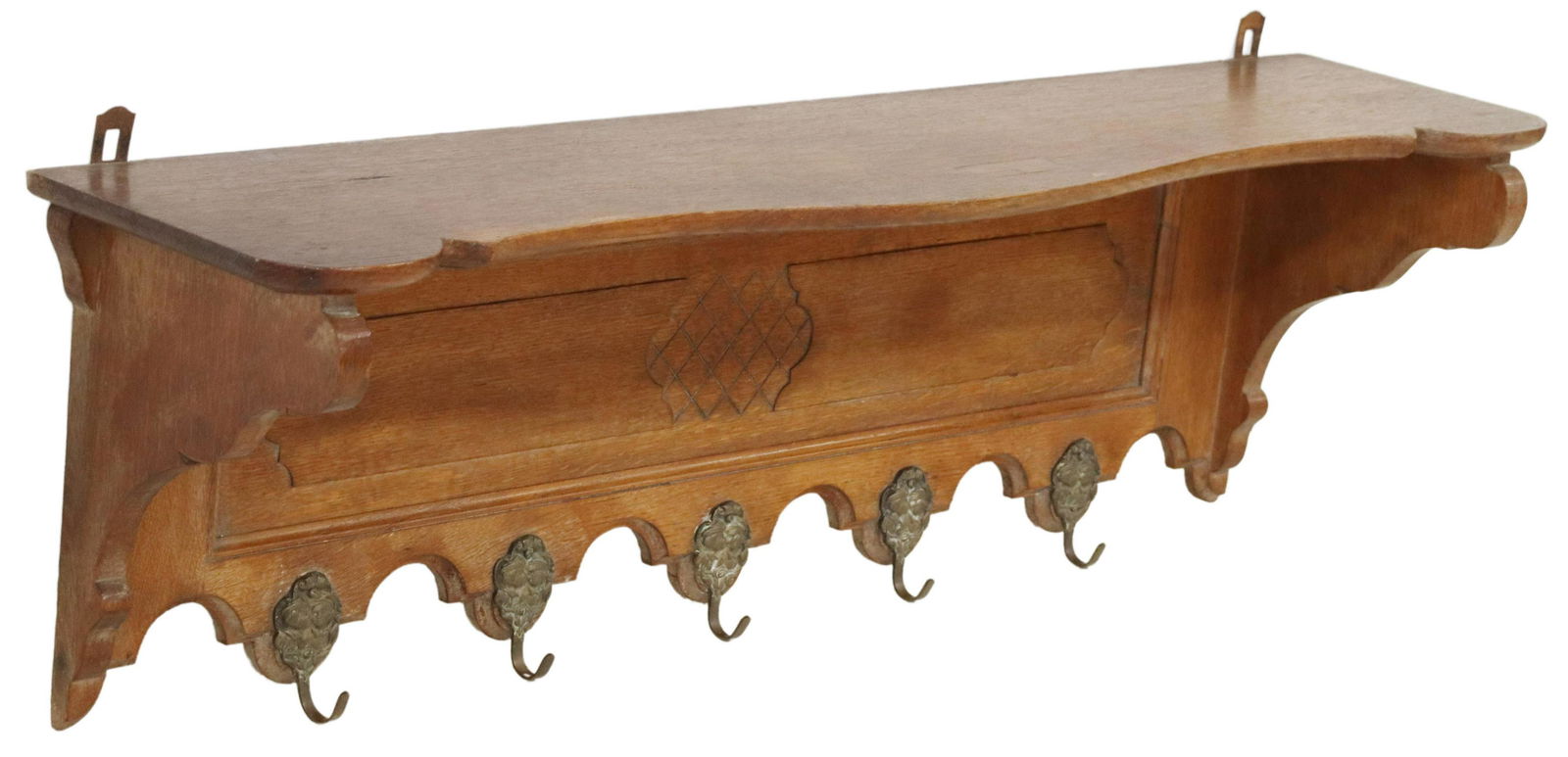 SoldFREDDY RENSONNET OAK WALL-MOUNTED HAT RACKBelgian oak wall-mounted hat/ coat rack, Freddy Rensonnet, 20th c., molded shelf over paneled backboard, seven gilt metal hooks with figural and foliate motifs, scalloped bottom edge, retaining labelSee Sold Price