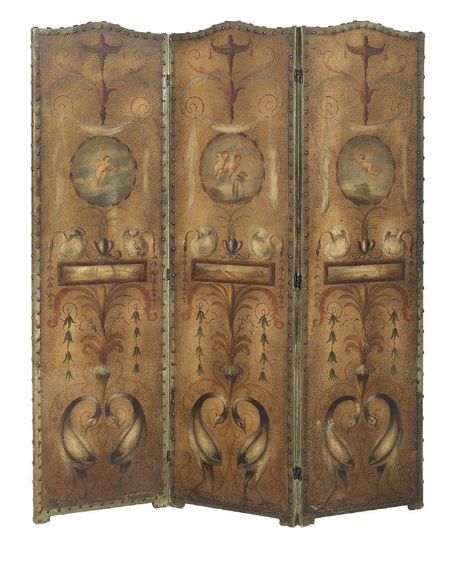 Early 20th Century Hand Painted Leather Four Panel Screen