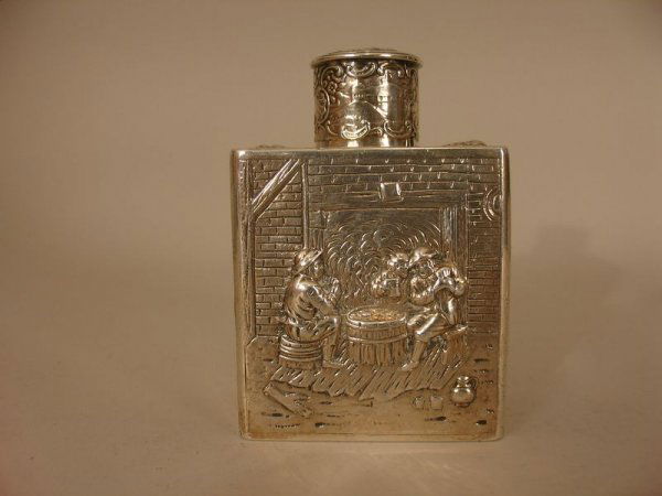 CONTINENTAL SILVER TEA CADDY W/EMBOSSED TAVERN S