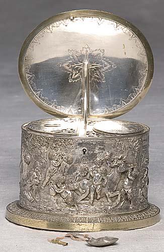 Excellent English George III Old Sheffield Silver Plate Serving PiecesFeb 28, 2026VICTORIAN MANNER COVERED SILVER TEA CADDY W HANDLESFeb 28, 2026Antique Continental Silver Tavern Scene Sterling Silver Trinket BoxFeb 28, 2026Continental Silver-Plated Jewelry Box7 days LeftVictorian Silver Plate Oval Tea CaddyMar 12, 2026RUSSIAN 84 SILVER IMPERIAL PRESENTATION TEA CADDY3 days LeftBeaded Sterling Silver Cut Glass Tea Caddy c.1915 4 x 3Mar 04, 2026A continental silver box probably Hanau, late 19th / early 20th century, unattributed makerGerman repousse silver singing bird box22 hrs LeftOttoman Empire Silver Spice Container, 19th C.Mar 19, 2026Antique German .800 Silver Tea Caddy Beaded Bright-Cut with Lion FeetFeb 26, 2026Austrian Sterling Silver Tea Caddy Eagle Finial Brite Cut c.18902 days LeftFerdinand Fuchs Sterling Silver Crystal Inkwell Vintage 4 x 34 days LeftDutch 833 Silver Locking Tea Caddy Circa 18234 days LeftGorham Medallion Sterling Silver Sugar Bowl Barrel Shape 1871Mar 01, 2026A silver-plate-mounted coco de mer tea caddy, late 19th century,6 days Left