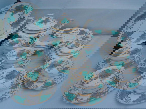 SoldTiffany&Co Grosvenor China Tableware England Set39Tiffany & Co Grosvenor China tableware set, 39 pieces. White china with hand painted scroll motif in green with gilt decoration. Trademarked to undersides. Made in England. 12 plates (8 inches), 12 saSee Sold Price