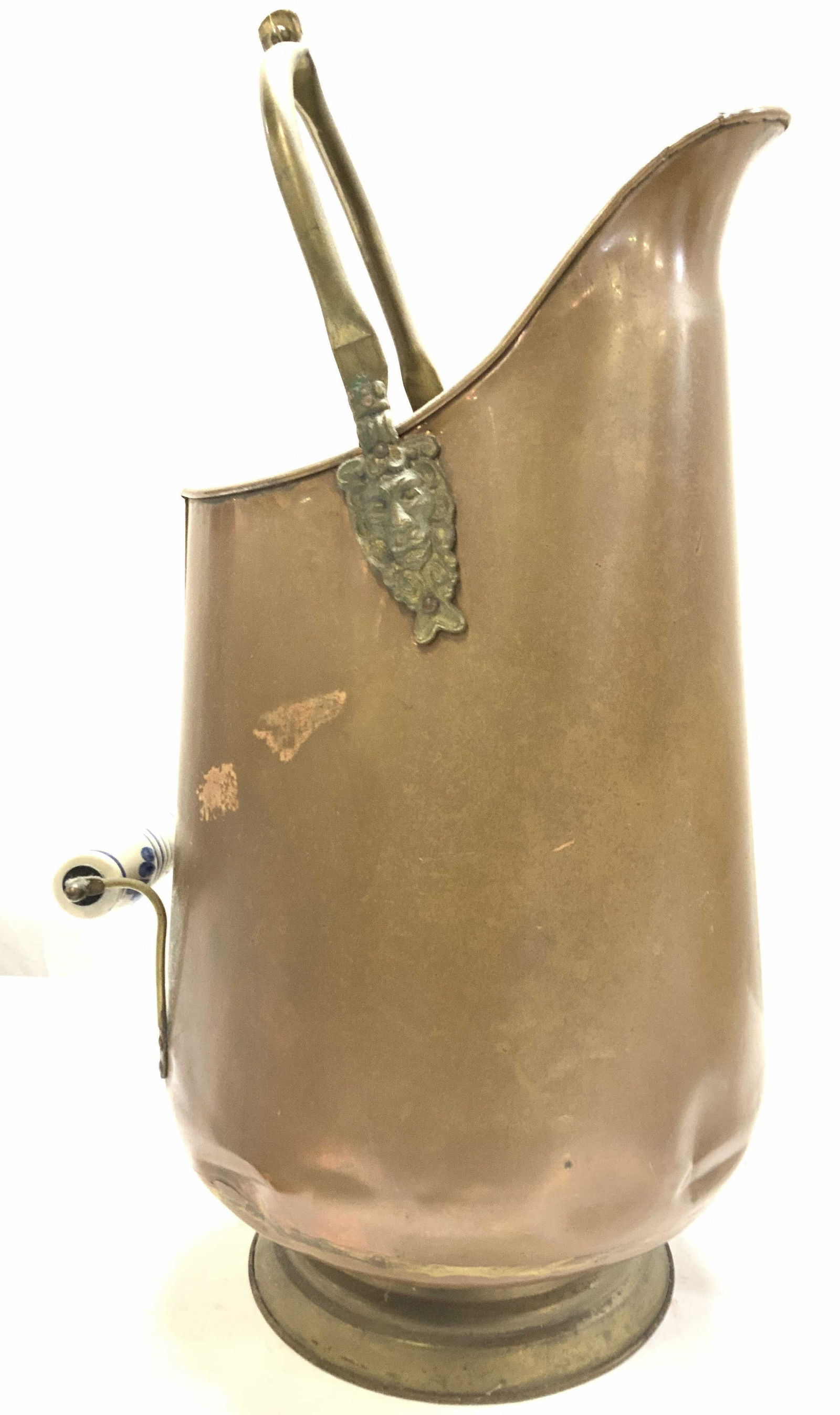 SoldLarge COPPER BRASS COAL ASH SCUTTLE BUCKET LION HEAD DELFT BLUE HANDLESTitle: Large COPPER BRASS COAL ASH SCUTTLE BUCKET LION HEAD DELFT BLUE HANDLES Date/Period: UNKNOWN Dimension: approx 17 x 16 Material: brass and ceramic Additional Information: Lovely COPPER BRASS COSee Sold Price