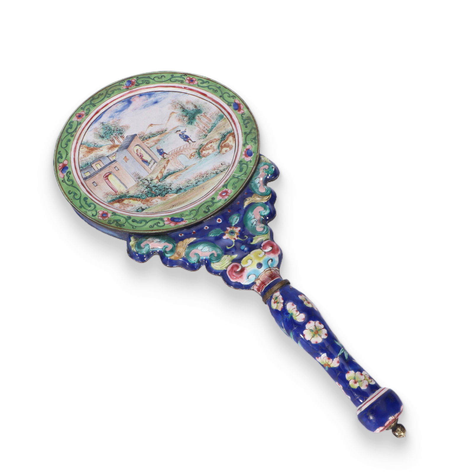 Copper-bodied painted enamel handle mirror