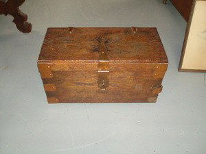 SoldThe Boys Favorite Tool ChestNice small Oak tool chest with interior tray and dove-tailed corners, with original label on interior lid. 18 in Long 9 inches wide 6 1/2 in tall.See Sold Price