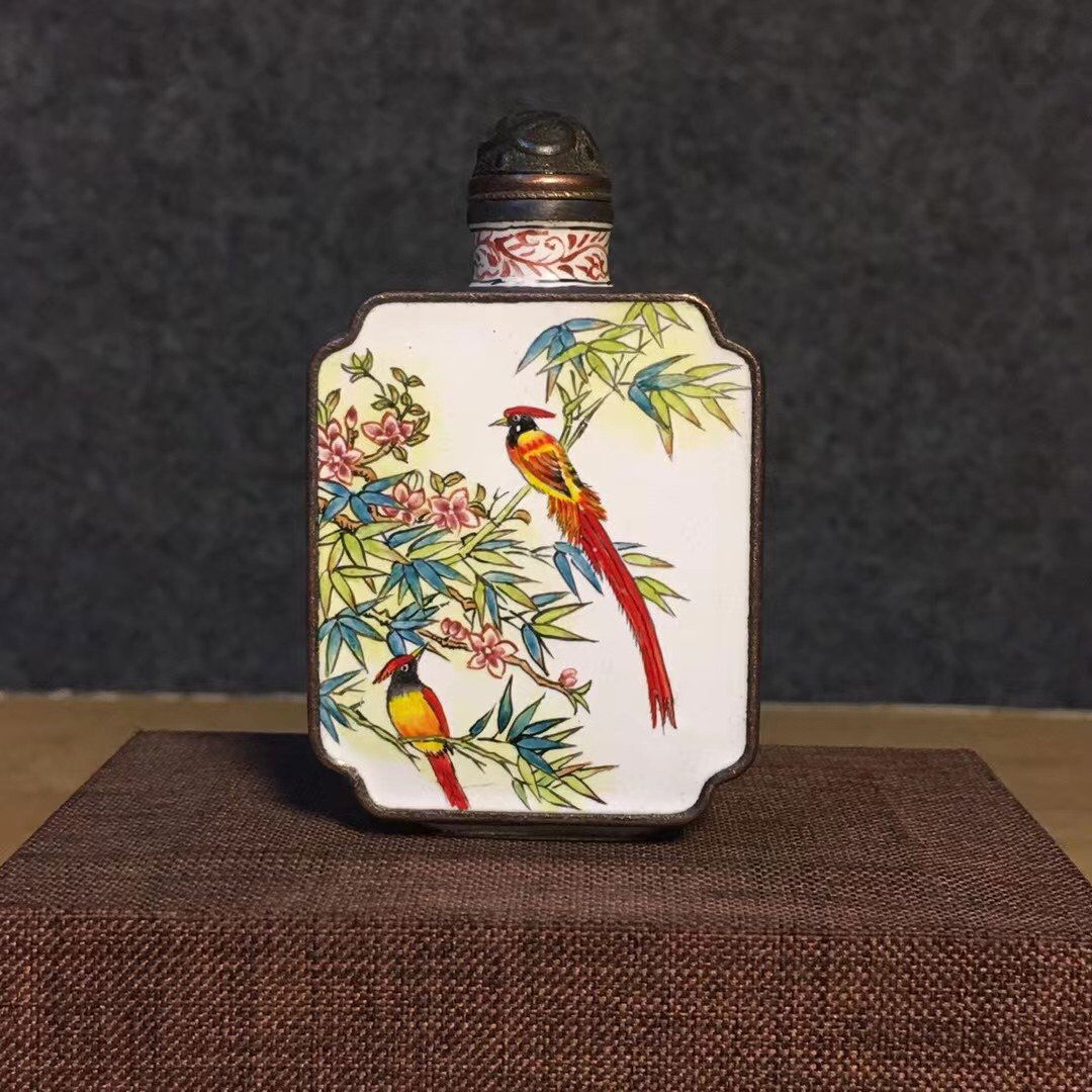 SoldAn Exquisite Painted Enamel on Copper Flower and Bird Pattern Snuff BottleAn Exquisite Painted Enamel on Copper Flower and Bird Pattern Snuff Bottle,Qing Dynasty,China,Qianlong Four-Character Mark,Size:1.8inx1.2inx3in,Weight:60g 铜胎画珐琅ŎSee Sold Price