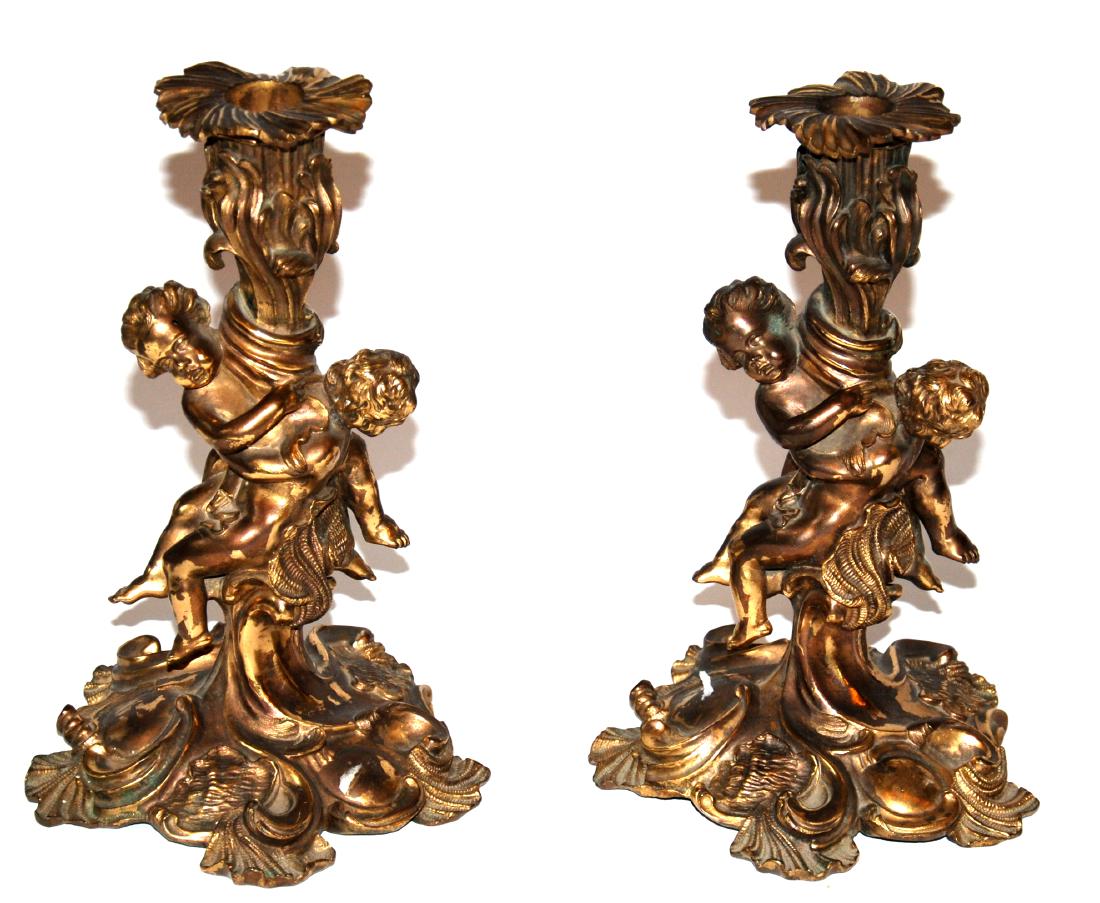 coppia di candelieri in bronzo con putti
