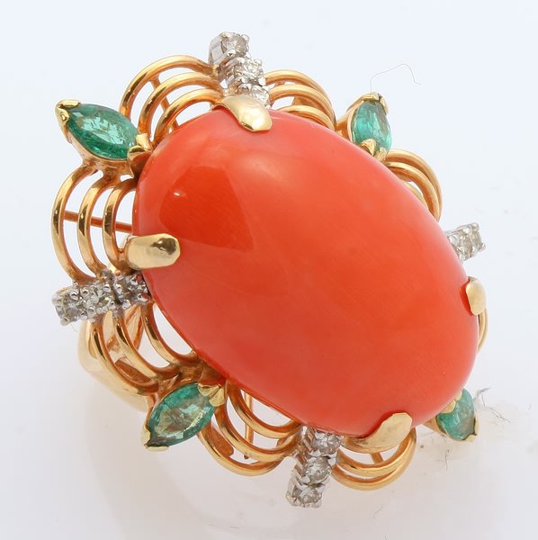 Coral, Emerald and Diamond Ring