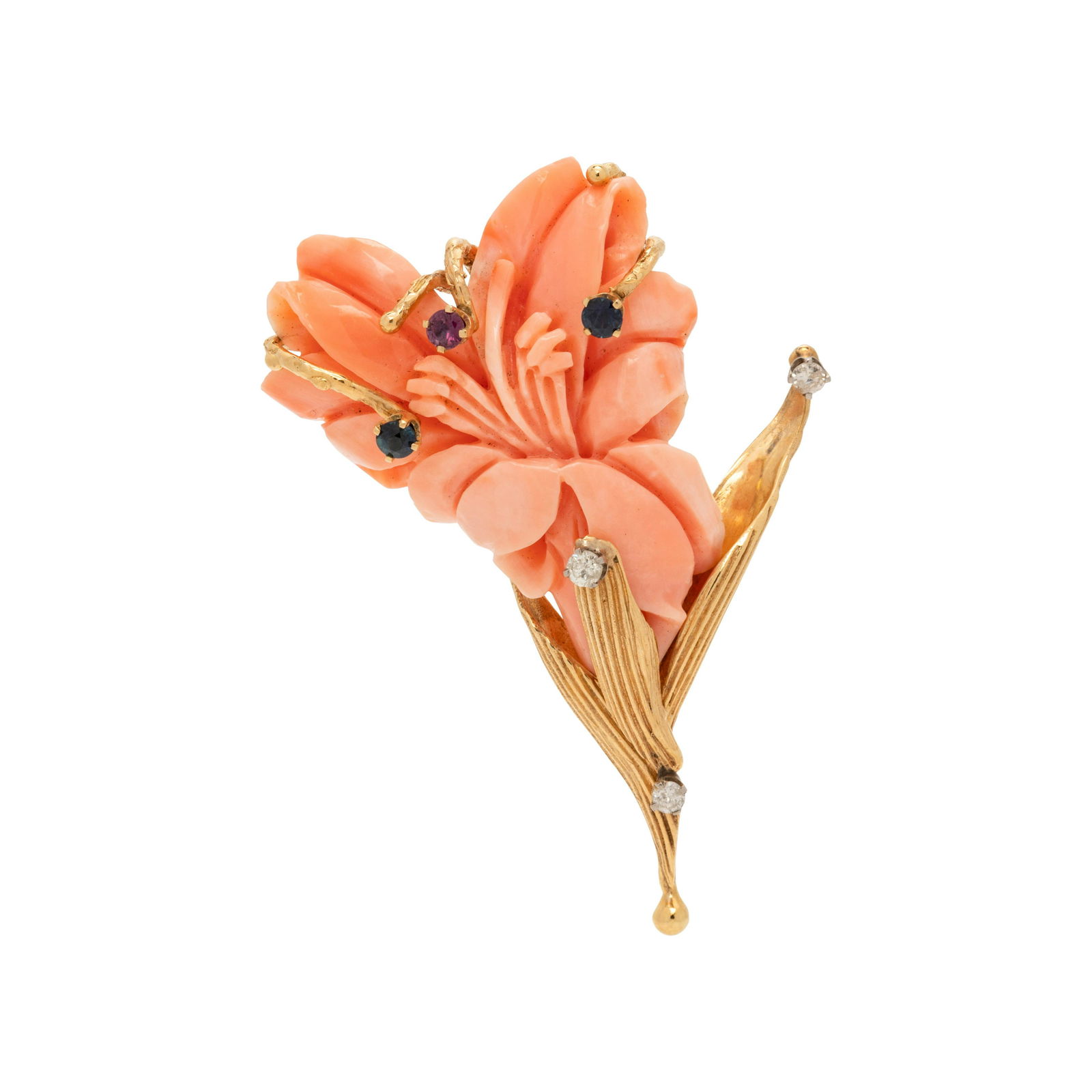 CORAL, SAPPHIRE, RUBY AND DIAMOND FLOWER BROOCH