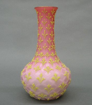 Sold5.5" PINK SATIN MOTHER OF PEARL CORALENE VASE5.5" PINK SATIN MOTHER OF PEARL CORALENE VASE DIAMOND AND CROSS DESIGN - NICE YELLOW CORALENE STAR HIGHLIGHTS See Sold Price