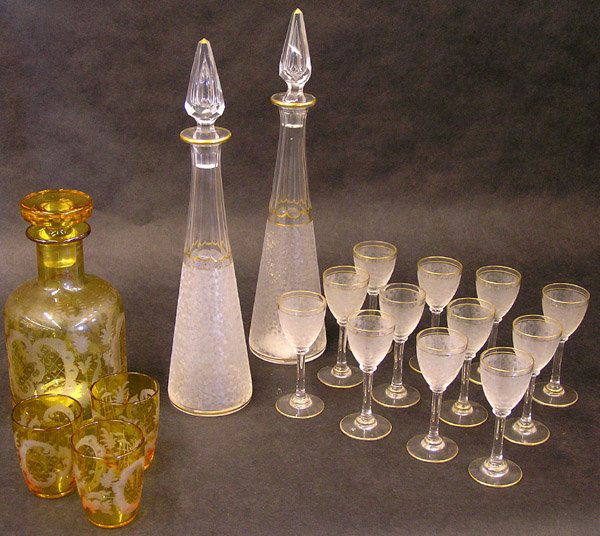 SoldThree Partial Art Deco Glass Cordial SetsIncluding rose, amber and yellow glass. Tallest 11"hSee Sold Price
