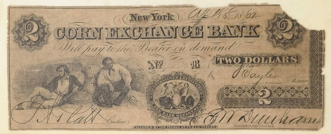 Sold2 Obsolete Currency NotesIncludes $2 American Exchange Bank of New York note dated 1852 and $1 Citizens' Bank of Louisiana note. New York note with tears, losses, folds and creases. Louisiana note with creases. RM IMPORTANT:See Sold Price