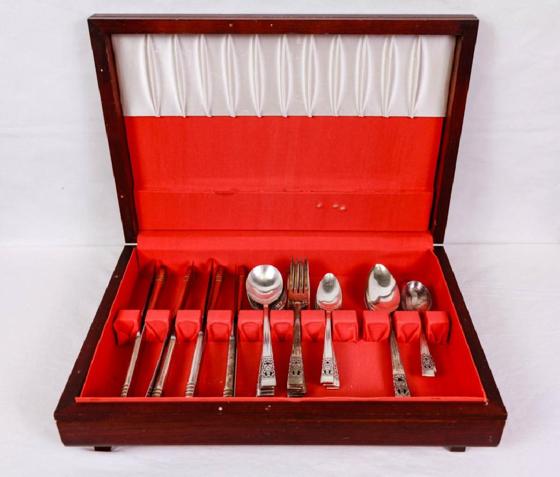 SoldCommunity Plate Silver plated Flatware w/ Case, approx 60 pcs & 2 Sterling Silver pcs, ~30 gramsOneida Community Silver Plate Coronation Mid Century Set. The flatware appears to be in good shape, though the back hinge is unattached, and the case has some wear. The case measures approx 4h x 19w xSee Sold Price