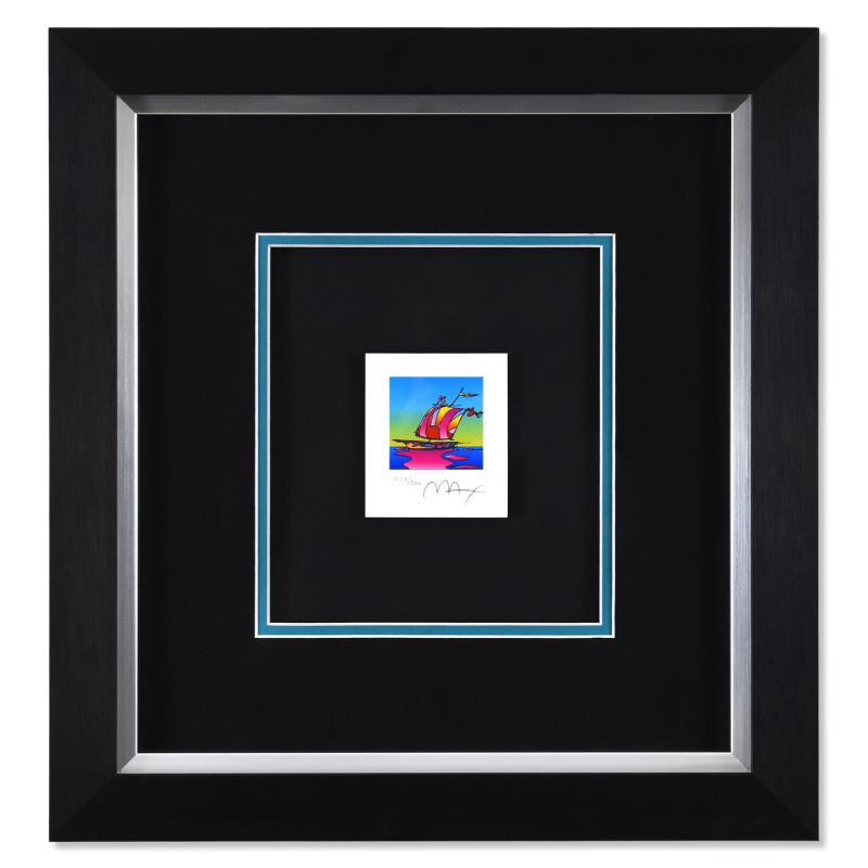 SoldPeter Max, "Sailboat with Heart" Framed One-of-a-Kind Acrylic Mixed Media, Hand Signed withSailboat with Heart is a one-of-a-kind acrylic mixed media on paper, hand signed by Peter Max. The piece comes custom framed with a backside cutout to display Peter Max Studio registration number 2480See Sold Price