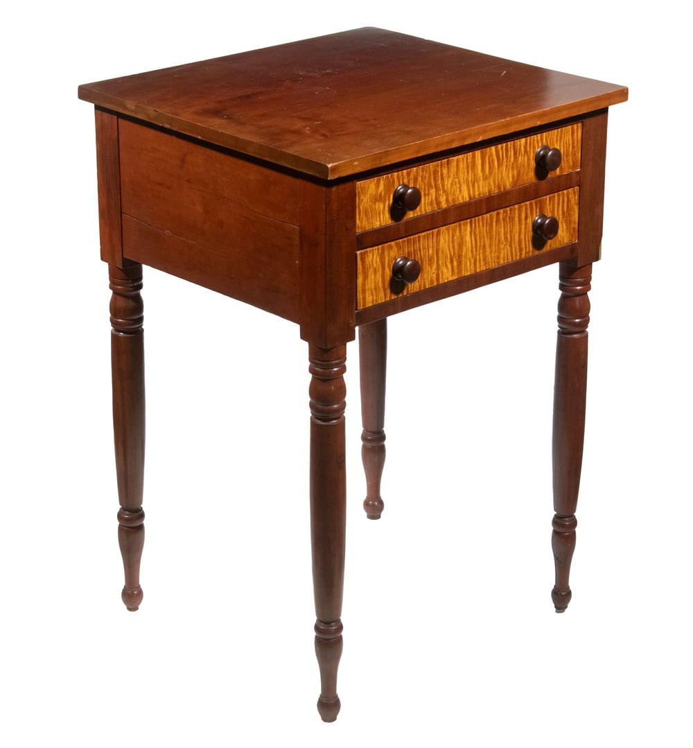 Sold19th Century Country Sheraton Work Stand19th Century Country Sheraton Work Stand. Circa 1850. Cherry and poplar. Curly maple drawer front, drawer is dove tail front and back. 22 3/4w x 20 3/8d x 29 1/8h.See Sold Price