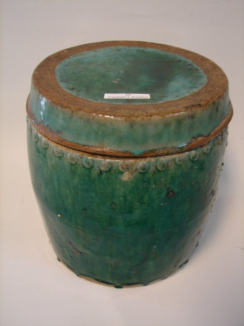 SoldGreen Glazed Chinese Covered Jar / Container.The Jar has a Mark on the Underside. It is Decorated with Bird and Floral Designs. It has some Crazing on the Top of the Jar. It measures 9 1/4" Tall and 7 3/8" in Diameter. It is in Good Overall CondSee Sold Price