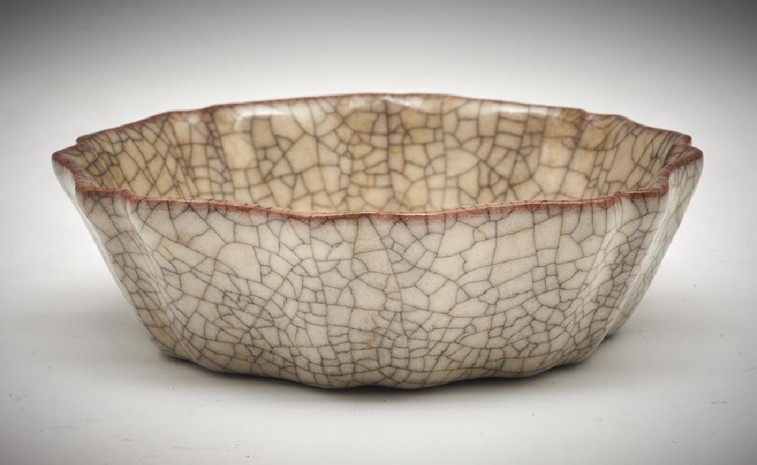 SoldChinese Ge-Type Mallow Form BrushwasherChinese Ge-Type Mallow Form Brushwasher Of flared sides indented with petal lobes, each lobe divided by a notched facet to the rim, the concave base with six spurs, covered all over in an ash-grey glaSee Sold Price