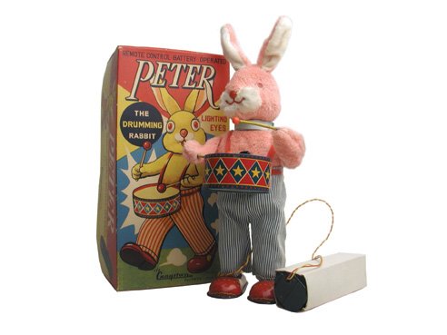 SoldTHREE JAPANESE BOXED BATTERY OPERATED RABBITS1409. THREE JAPANESE BOXED BATTERY OPERATED RABBITS | Includes AHI Peter Drumming Rabbit and Alps Bunny the Magician and Picnic Bunny. | 12" h. | Picnic & Magic inoperative, Peter box has tape on cornSee Sold Price