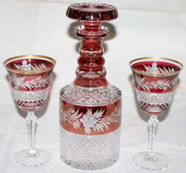 CRANBERRY OVERLAY CRYSTAL DECANTER, TWO GOBLETS